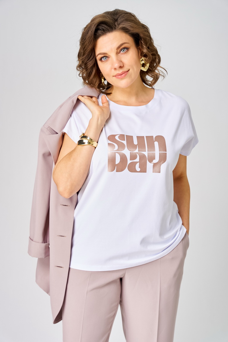 Костюм женский 3-х предметный, состоящий из жакета, топа и брюк. Жакет прямого силуэта без подкладки с центральной застежкой на 3 пуговицы и воротником пиджачного типа. Перед с вертикальными рельефами и прорезными карманами с листочками, спинка со средним швом и отрезными бочками. Рукава втачные двухшовные с притачными манжетами по низу. Брюки прямые зауженные книзу с заутюженными стрелками на притачном поясе с резинкой сзади и застежкой спереди на молнию и пуговицу. Топ из трикотажного полотна с цельнокроенными рукавами и декоративной печатью спереди, горловина обработана притачной бейкой.