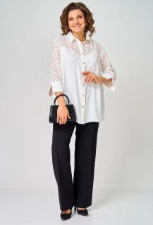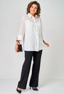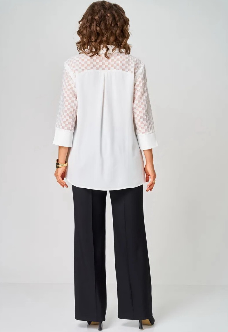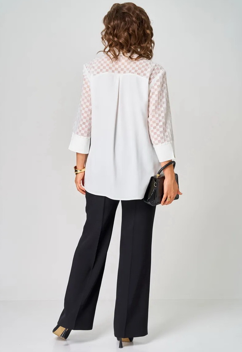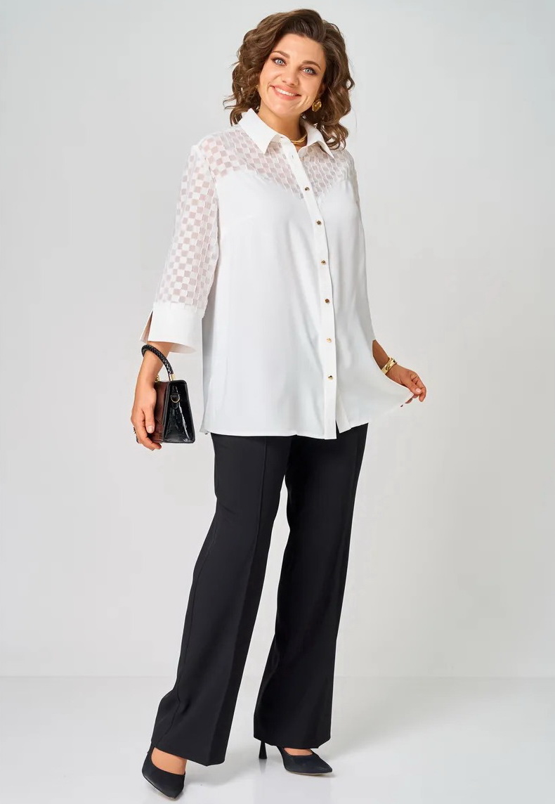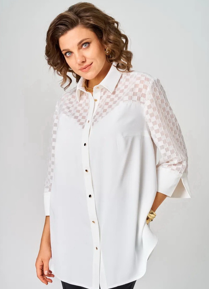 Туника однотонная женская больших размеров - универсальная plus size одежда женская. Белая блузка от женская одежда белорусского производства бренда ALEZA. Красивая блузка женская прямого силуэта со стояче-отложным воротником на отрезной стойке с центральной застежкой на кнопки на отрезных планках. Туника вечерняя женская - перед с отрезными фигурными кокетками, спинка с отрезной кокеткой и бантовой складкой, рукава три четверти втачные одношовные с притачными манжетами. Блуза для полных женщин выполнена из двух видов ткани. Эта новинка для женщин сочетает в себе элегантность и комфорт. Она идеально подходит для офиса, придавая образу классический стиль. Модель выполнена из немнущейся ткани, что добавляет эстетичности и притягательности. Нарядная блуза отличается укороченным рукавом с разрезами, что предоставляет возможность создать разные стили. Легкая блузка длинный рукав прекрасно подойдет на выпускной или любое другое мероприятие. Стильная офисная одежда станет отличным выбором для осеннего, весеннего или летнего времени года и разнообразит ваш гардероб. Эта рубашка легко комбинируется с пиджаком или юбкой, а также подойдет для вечернего выхода. Элегантная блуза подходит для женщин больших размеров, которые ищут красивую и модную одежду на праздничные мероприятия. Блузка-рубашка прекрасно дополнит офисный строгий стиль и придаст уверенности. Блузка к юбке замечательное решение для школы или деловых встреч! Тренды одежды больших размеров. Классическая модель, которая останется актуальной на протяжении всего года и станет верным спутником в разных ситуациях. Стремление к стилю никогда не было таким простым благодаря этому трендовому элементу в вашем гардеробе. Украшения подойдут к ней любой изысканности!