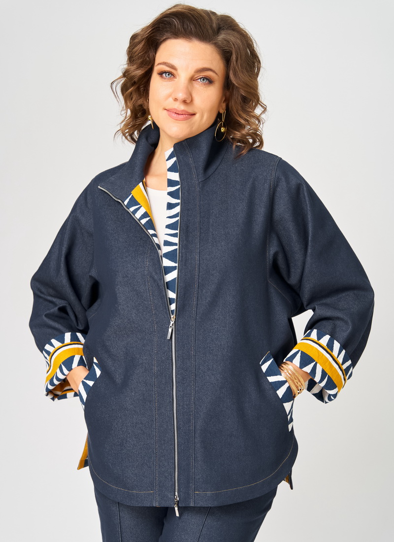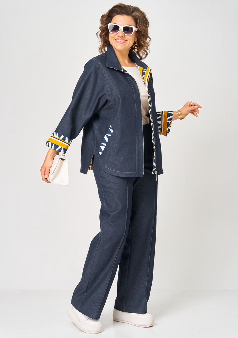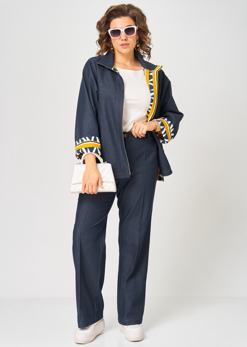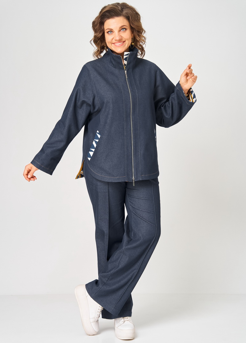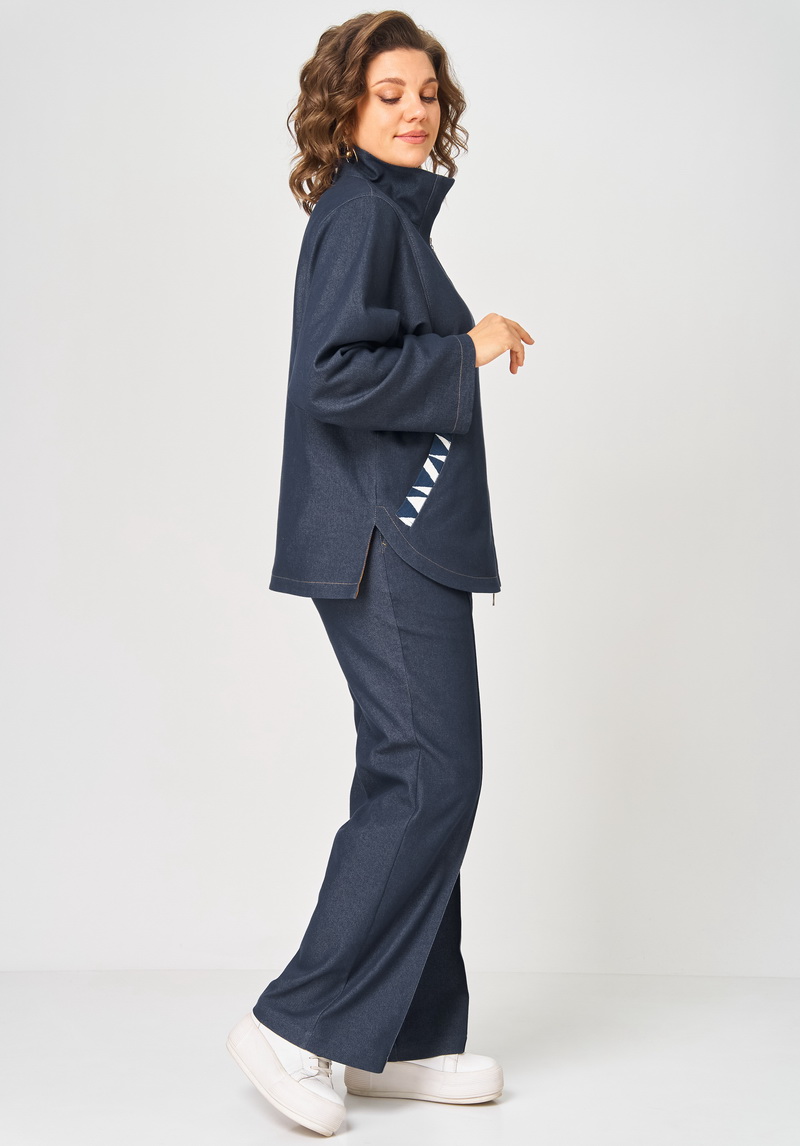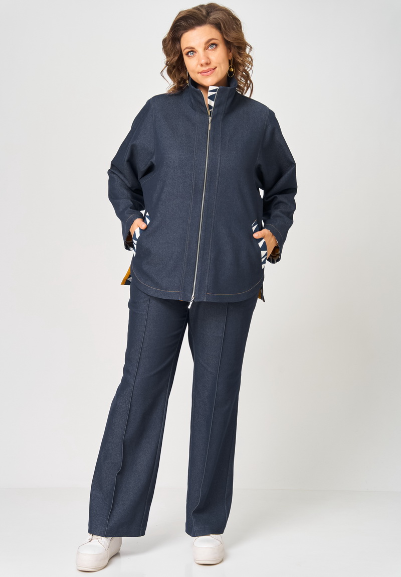 Костюм женский из облегченного деними состоящий из куртки и брюк . Куртка прямого силуэта на подкладке с центральной застежкой на молнию и воротником стойка. Перед с отрезными планками, прорезными карманами фигурной формы выполненными из отделочной ткани, спинка цельная, рукава рубашечного типа с квадратной проймой и манжетами из отделочной ткани, низ фигурной формы. Брюки прямые на притачном поясе с резинкой сзади , с застежкой спереди на молнию и пуговицу, с боковыми карманами и застроченными спереди стрелками. Швы в костюме отстрочнены отделочными нитками контрастными по цвету.