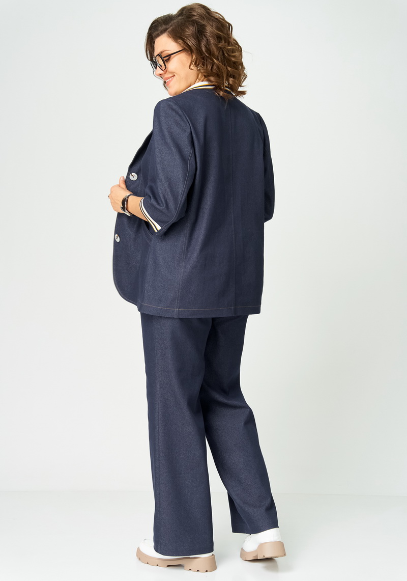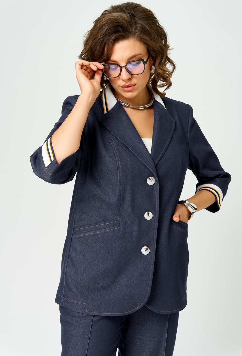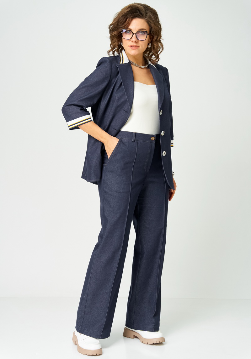 Костюм женский двухпредметный из денима, состоящий из жакета и брюк. Жакет прямого силуэта без подкладки с центральной застежкой на 3 пуговицы и воротником пиджачного типа с трикотажным довязом. Перед с вертикальными рельефами и прорезными карманами с листочками, спинка со средним швом и отрезными бочками. Рукава втачные двухшовные частично с трикотажными довязами по низу. Все швы отстрочены отделочными строчками контрастными по цвету.