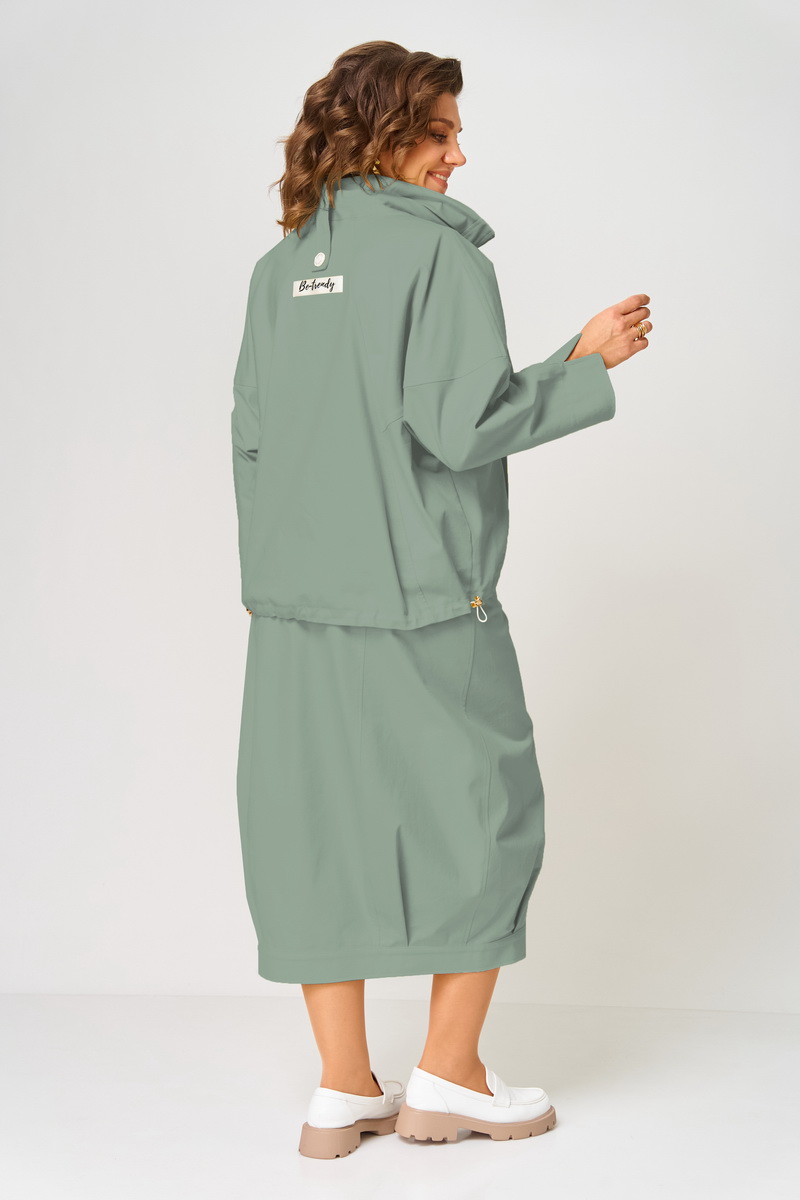 Костюм женский из облегченного денима , состоящий из куртки и юбки. Куртка объемной формы без подкладки с центральной застежкой на молнию , воротником стойка фантазийной формы с бантовыми складками и асимметричной линией низа, но которому выполнена кулиска с эластичным шнуром и фиксаторами.. Перед с отрезными кокетками, наклонными рельефами и карманами с листочками около швов. Спинка с втачной средней частью с декоративной нашивкой и отрезными кокетками. Рукава цельнокроенные с разрезами по низу. Юбка прямого силуэта на притачном поясе с застежкой спереди на молнию и пуговицу и притачным поясом с резинками в области боковых швов. Передние половинки со средним швом, заканчивающимся шлицей и боковыми карманами. Задние половинки со средним швом, наклонными рельефами и накладными карманами. По низу юбки односторонние складки спереди и сзади и притачная планка
